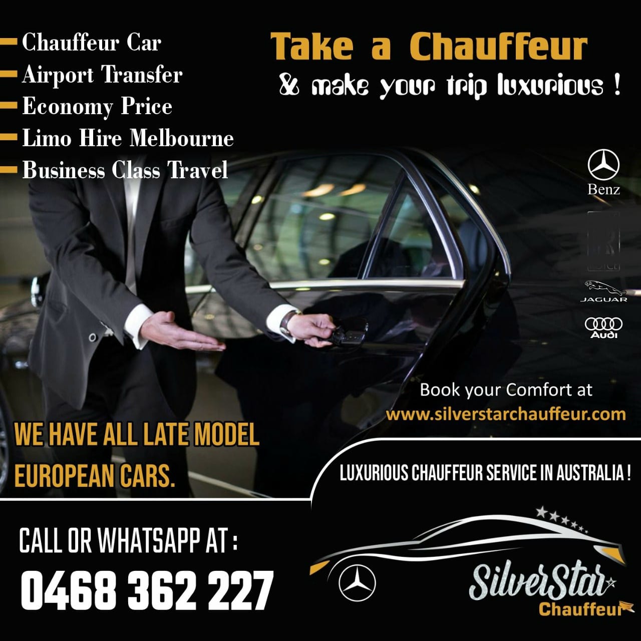 Sometimes it's hard to choose a product online when so many companies promising the same service, pricing, and product. With 5 Star GOOGLE rating we are best Chauffeur service Provider. Our competitive chauffeur car service rates and our premium service make it easy for you to book and travel from A to B.. With the strong backing of highly trained, experienced, and licensed drivers, we can assure you that you will have a pleasant traveling experience with us. So, whenever you are on a personal, leisure, or business trip, book a Car with us to get the best offers for your ride. Chauffeur Car Melbourne, Airport Transfer Melbourne, Wedding Car Hire, Limo Hire You can Pre-Book a Chauffeur with us to take off the stress about how you get to your next destination. At SilverStar Chauffeur , you can be assured that you will be picked at the location of your choice. No matter you are traveling alone, or with a group of professionals, we provide excellent service to our customers. Possessing years of rich experience in serving travellers, we strive to offer our customers comfortable and safe transportation solutions. Melbourne Airport Pickup, Luxury Chauffeur driven cars, Private Tours, Winery tours, Chauffeur Vans, Hotel transfers. We also provide CAR HIRE WITH BABY/INFANT SEAT, LUXURY SUV OR PROPLE MOVER, 7-14 Seaters. Get A Quick Quote or book online.